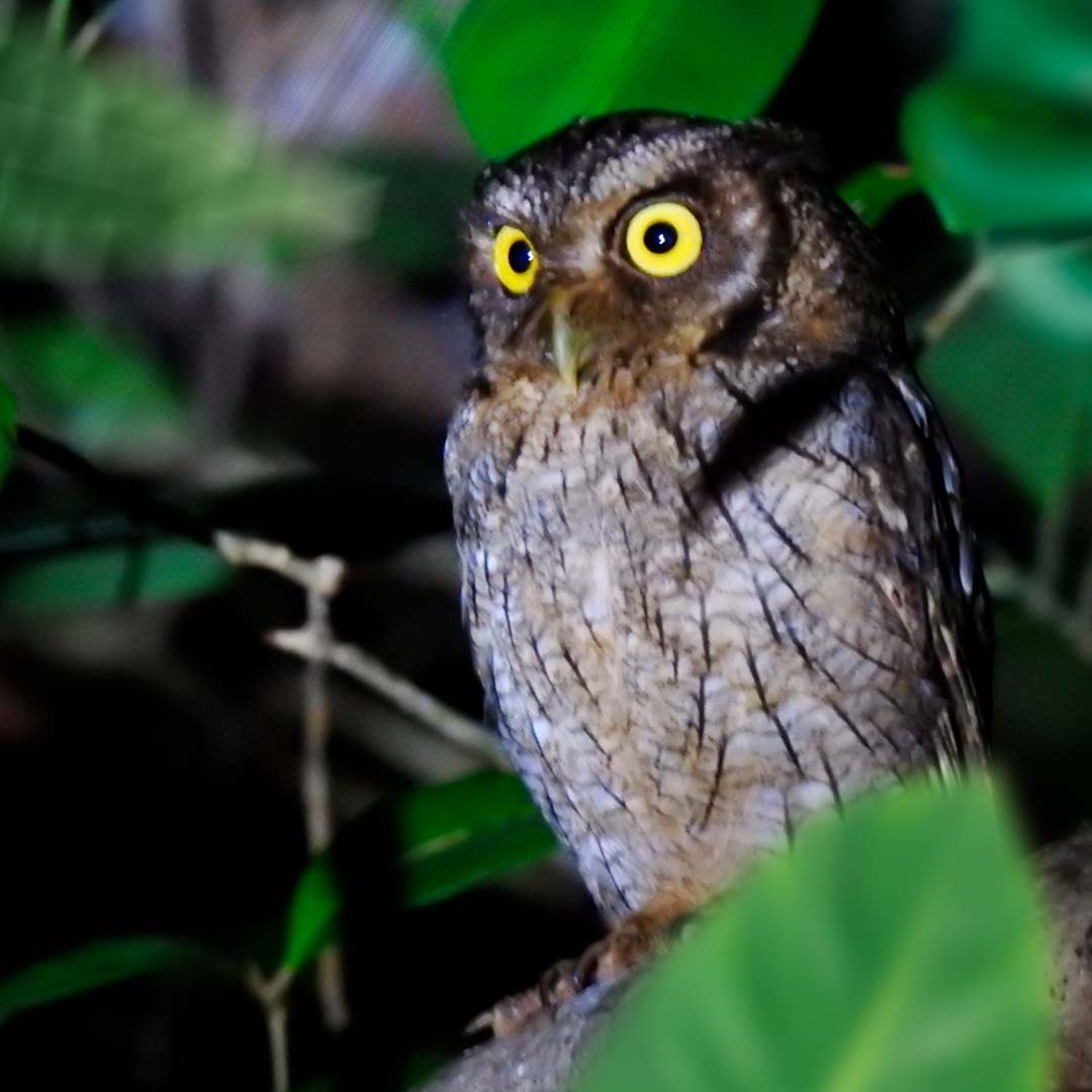 Trilha para observação de corujas e outros animais noturnos, experiência de sentir/ouvir a floresta durante a noite. Acontecem pela Floresta do Aruá, Mata Atlântica preservada, com guia especializado.